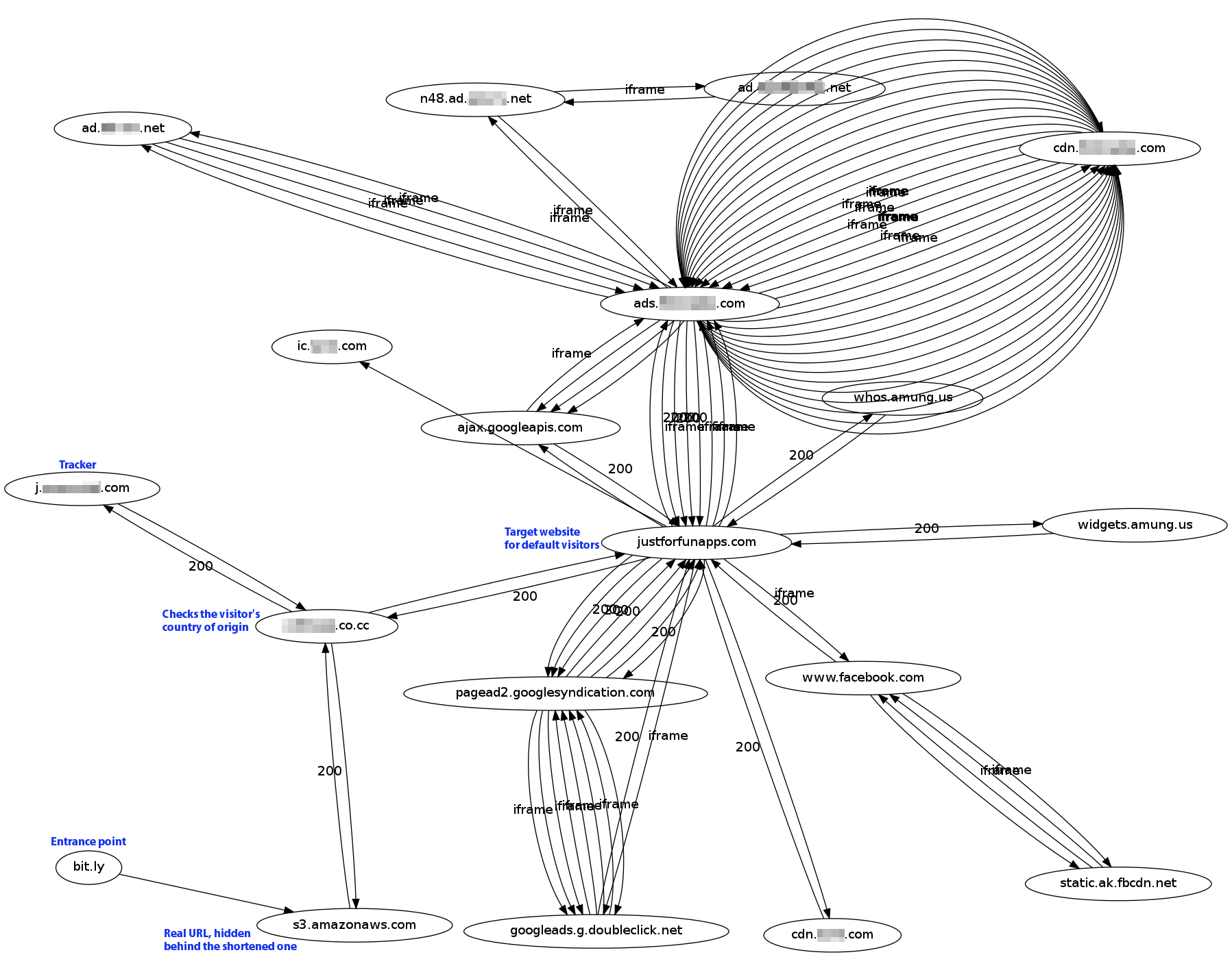 Die verkürzte URL führt zu einer langen URL, die ausschließlich dazu dient, das Herkunftsland des Nutzers festzustellen. Je nach Ergebnis gerät der Nutzer in eine eindrucksvolle Weiterleitungskette mit zahlreichen, per iFrames eingebundenen Werbediensten. Jeder “Besuch” dieser Websites lässt beim Angreifer die Kasse klingeln.