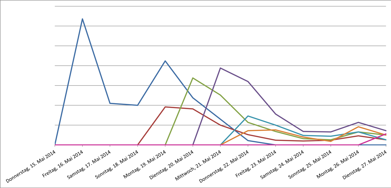 Nachfolgende Grafik zeigt an Beispielen des aktuellen Falls, wie sich die einzelnen Schemata auswirken. Gezeigt werden die Anzahlen der Aufrufe der von G DATA geblockten Webseiten. Deutlich zu erkennen sind die Wellenformen, mit deutlichen Spitzen zu Beginn eines neu angelegten Schemas.