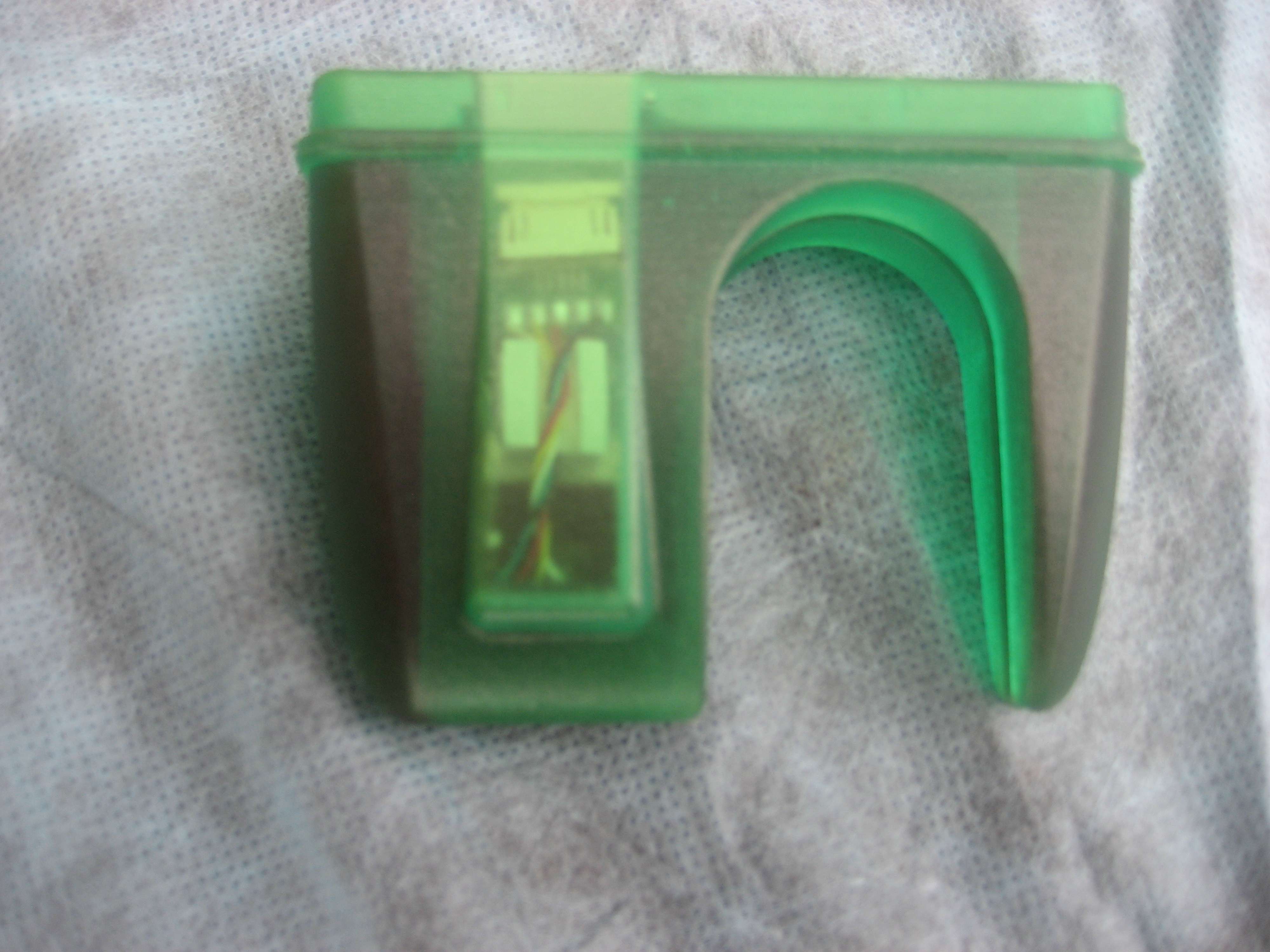 Der Sensor ist die grüne Box auf der linken Seite, mit dem Metallclip unten, und der Leser ist das Element in der Mitte mit dem weißen und roten Draht.