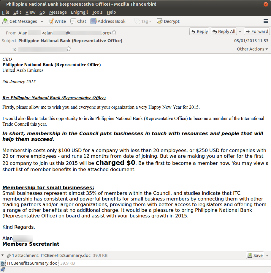 Der oder die Angreifer schickte(n) eine speziell manipulierte E-Mail an mindestens einen Mitarbeiter des angegriffenen Unternehmens. Im Text der E-Mail geht es um ein geschäftliches Thema: ein Angebot, Mitglied des diesjährigen Internationalen Handelsrates zu werden. Das Angebot ist jedoch an die Philippinische Nationalbank gerichtet, nicht an das Unternehmen, das die E-Mail tatsächlich erhält. Dies könnte ein Trick sein, um den Empfänger noch neugieriger auf den Inhalt des angehängten Dokuments zu machen, weil er Dokumente erhielt, die nicht für ihn bestimmt waren.Die Experten von G DATA alarmierten das Team von aeCERT über den Zwischenfall und ihre Analyseergebnisse.