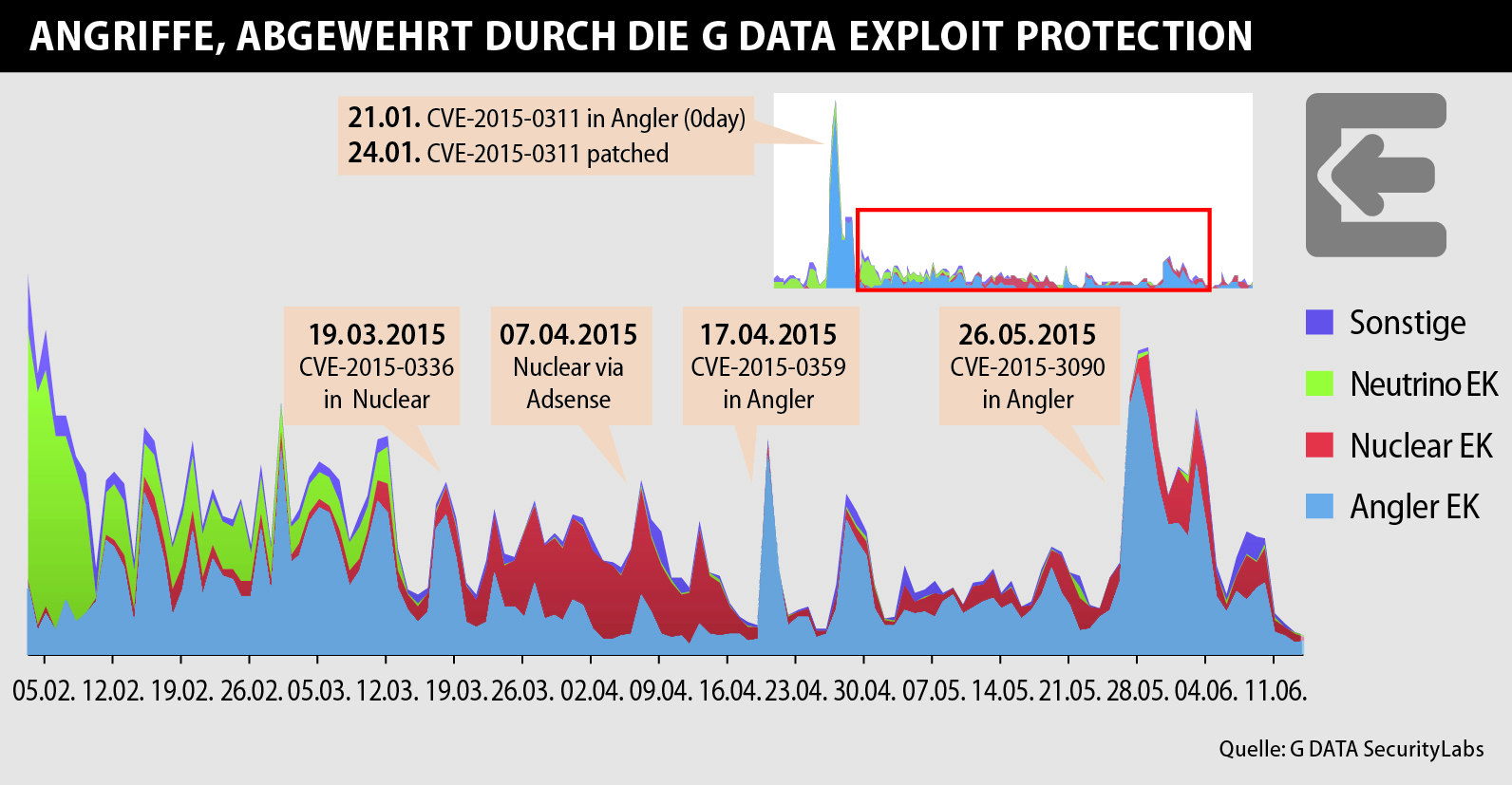 - Am 21. Januar wurde im Angler Exploit Kit eine bis dahin unbekannte und nicht geschlossene Sicherheitslücke in Adobe Flash integriert (CVE-2015-0311). In den folgenden Wochen maßen die Spezialisten der G DATA SecurityLabs Rekordzahlen für die Abwehr von Exploits.
