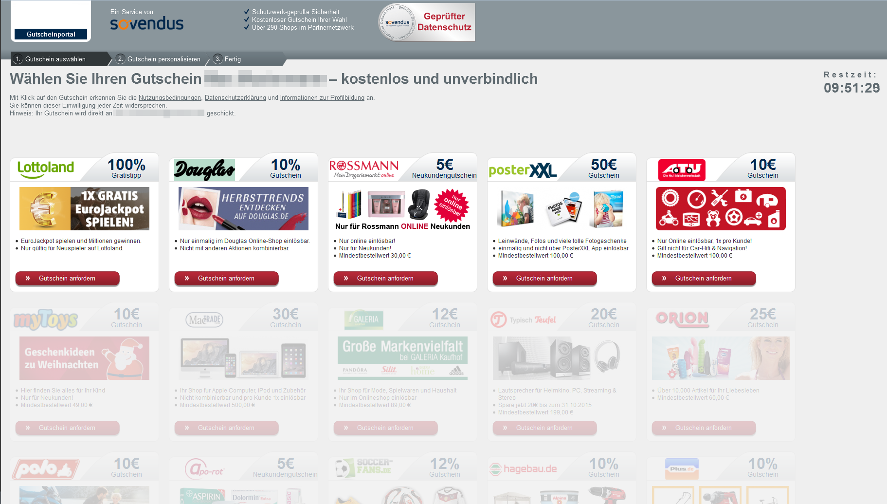 Das „gratis Geschenk“ ist nun zu einem „kleinen Geschenk“ geworden und besteht aus einem Gutschein aus dem „exklusiven Partnernetzwerk“ – alles wird groß mit den Worten „gratis“ beworben. Der Teilnehmer wird auf eine weitere Webseite geleitet: sovendus.com Selbstredend hat dies nicht im Geringsten etwas mit dem versprochenen Rewe-Gutschein oder gar dem Technik-Gadget zu tun, was uns noch immer auf der Webseite im Banner entgegenstrahlt. Wir gehen nicht davon aus, dass wir eine Chance darauf haben, das Lockangebot je in den Händen zu halten.