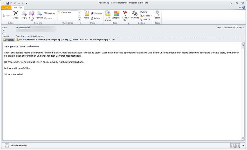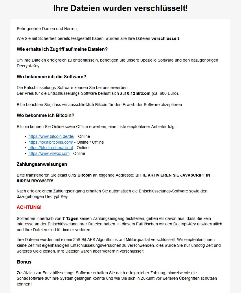 Besonders erwähnenswert ist die Erpressernachricht – sie ist in 100% fehlerfreiem Deutsch verfasst. Man kann davon ausgehen, dass der Verfasser des Textes ein Muttersprachler ist. Auffällig ist auch, dass in der Erpressernachricht ein Stück Programmcode versteckt ist, der jedes mal eine neue Bitcoin-Adresse generiert, an die eine Lösegeldzahlung gesendet werden soll. Bisher konnten wir dieses Verhalten noch bei keiner anderen Ransomware entdecken. Zweck dieser Vorgehensweise ist möglicherweise, die Verfolgung von Zahlungsströmen durch Strafverfolgungsbehörden zu erschweren. Anhand einer der E-Mails, in denen die Schadsoftware versteckt war, könnten Personalabteilungen ein erklärtes Ziel sein, wie seinerzeit bei Petya.