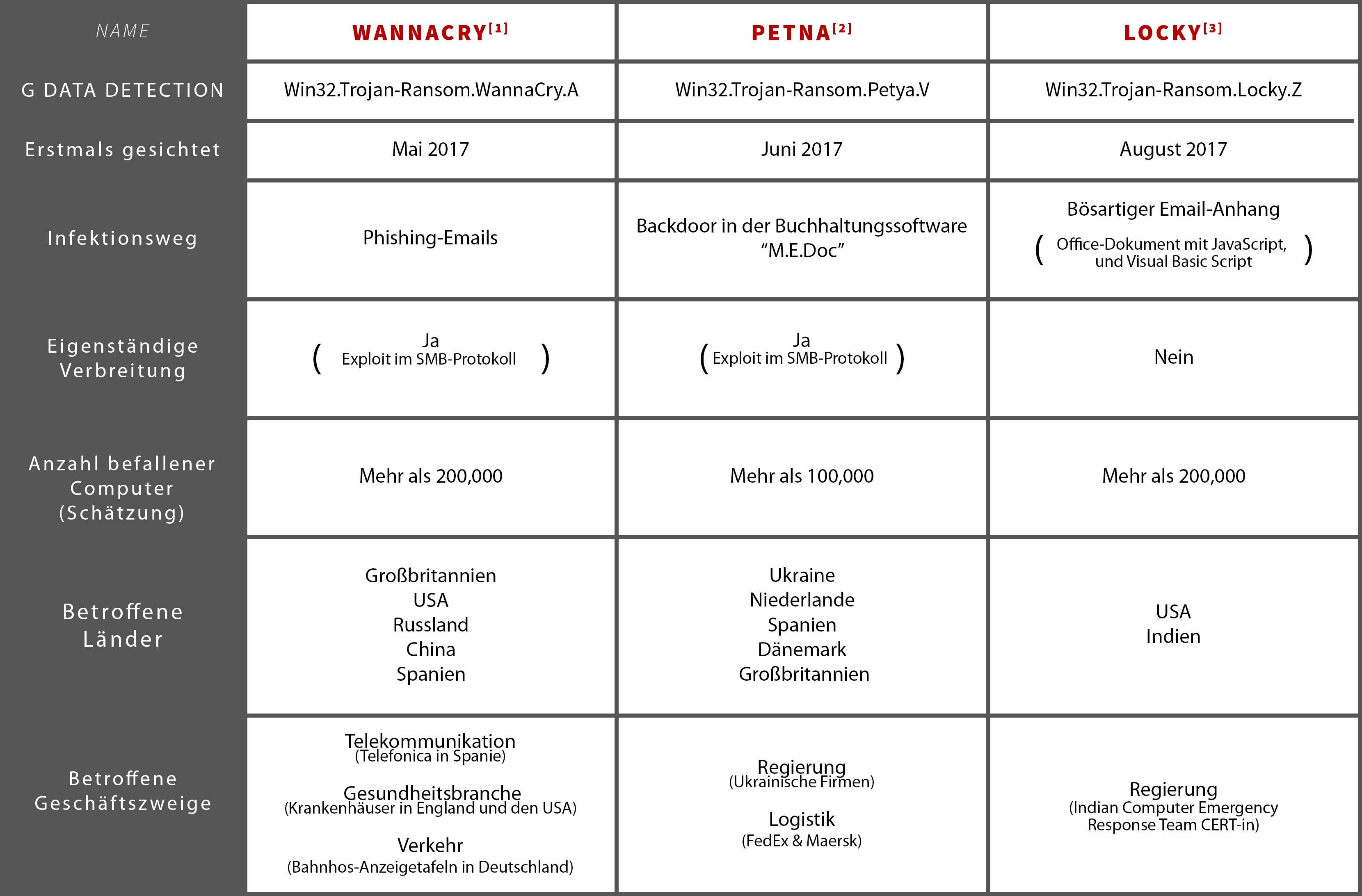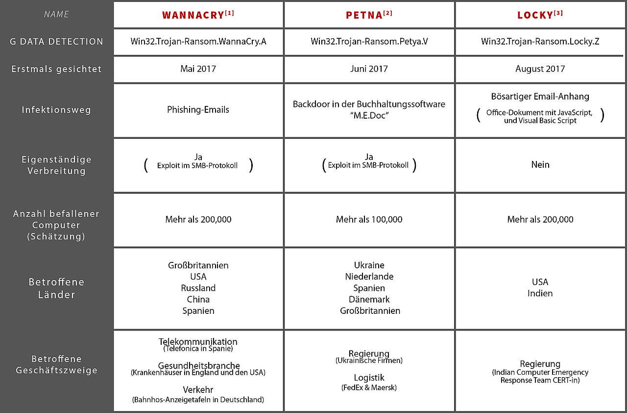 Werfen wir einen Blick auf die prominentesten Vertreter der Gattung Ransomware und darauf, wie solche astronomischen Schadenssummen zustande kommen. Die nachfolgende Tabelle enthält Hinweise auf ein bestimmtes Verhaltensmuster, nach dem sich Malware-Autoren zunehmen auf Wirtschaftszweige kontentrieren, in denen die Absicherung wichtiger Kundendaten einen hohen Stellenwert hat. Die Tatsache, dass Lösegelder gezahlt werden und dass hier massive Imageschäden angerichtet werden, unterstreicht, dass diese Strategie Wirkung zeigt. Petna bildet hier eine Ausnahme, da dieser Schädling nie dazu gefdacht war, Profit zu generieren. Stattdessen war Petnas Ziel, betroffene Betriebe lahmzulegen.