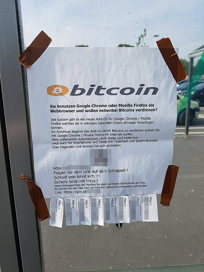 Normalerweise erreichen uns schädliche, verdächtige Dateien oder Links per Mail. In diesem Fall jedoch wurde uns ein Foto zugesandt, auf dem ein „Werbebanner“ aus Papier zu sehen war und das für Kryptomining per Browser Werbung machte. Der Einsatz von Browser-Plugins für das Schürfen von Kryptowährungen ist nicht neu.