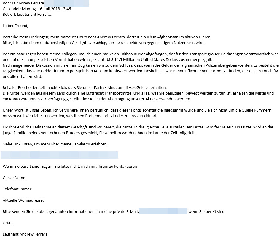 Die erste Mail stammt von einem angeblichen Militär-Angehörigen. Welcher Nationalität er angehört, wird allerdings im Verlaufe der Mail nicht klar. Auffällig ist, dass an mehreren Stellen in der Mail kyrillische Zeichen auftauchen. In der Nachricht behauptet er, dass er zusammen mit seinem Einheit einen „radikalen Taliban-Kurier“ (sic!) abgefangen habe, der eine größere Geldsumme bei sich getragen hätte. Da man aber befürchte, dass die afghanische Polizei, der man den Kurier übergeben wolle, das Geld in die eigene Tasche steckt, wolle man das Geld stattdessen lieber dem Empfänger der Mail zukommen lassen.