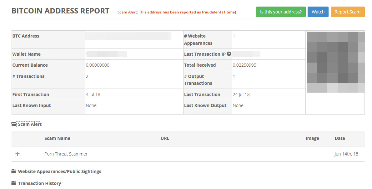 In der Mail war zudem eine Bitcoin-Adressen angegeben, an die das „Schweigegeld“ gezahlt werden sollte. Eine schnelle Online-Recherche ergab, dass derzeit kein aktiver Zahlungsverkehr auf dieser Wallet stattfindet. Es war genau eine Zahlung in Höhe von etwa 300 Euro darauf zu verzeichnen. Auf einer Webseite (z.B. www.bitcoinwhoswho.com) war die Wallet sogar als „Verdächtig im Zusammenhang mit Betrugsfällen“ markiert – ein weiteres recht sicheres Indiz dafür, dass es hier nicht mit rechten Dingen zugeht.