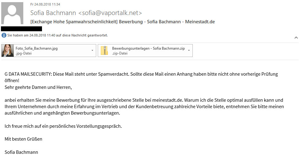 „Die von uns erkannten und abgewehrten Bedrohungen richten sich vor allem an Unternehmen“, sagt Tim Berghoff, Security Evangelist bei G DATA. „Die Kriminellen arbeiten sehr professionell, wir sehen im Unterschied zu anderen Ransomware-Kampagnen kaum orthographische Fehler. Außerdem wird bei jeder Malware-Welle ein professionell aussehendes Bewerbungsbild verwendet. Aus unserer Telemetrie geht hervor, dass die Erkennungen mit jeder neuen Welle zunehmen - entweder versenden die Kriminellen mehr E-Mails, oder sie haben einen besseren Datensatz mit einem größeren Teil tatsächlich aktiver Mailadressen.“ Die aktuelle Kampagne läuft seit rund einer Woche, an fast jedem Tag wird eine neue Bewerbung erstellt und versendet. Am Montag wurden die Bewerbungen unter dem Namen Hannah Sommer verschickt, frühere Wellen wurden mit den Namen Viktoria Hagen, Caroline Schneider, Nadine Bachert und Sofia Bachmann versehen.
