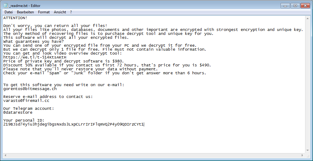 Das können Exploitkits sein, die via E-Mail infizierte Word-Dokumente versenden. STOP Ransomware verschlüsselt beispielsweise Office-Dokumente, Bilder- und Video-Dateien sowie PDF-Dateien. Ausführbare Dateien verschont die Schadsoftware. Es geht den Angreifern nicht darum, systemrelevante Dateien zu verschlüsseln, sondern wichtige Kundendaten unbrauchbar zu machen – solange, bis die Anwender Lösegeld zahlen. Darüber hinaus modifiziert STOP Ransomware die HOSTS-Datei, so dass sie den Zugriff auf bleepingcomputer.com blockiert. Das ist die Seite schlechthin, bei der Opfer von Ransomware-Infektionen kompetente Hilfe finden. Die Seite bietet unter anderem Decrypter an.