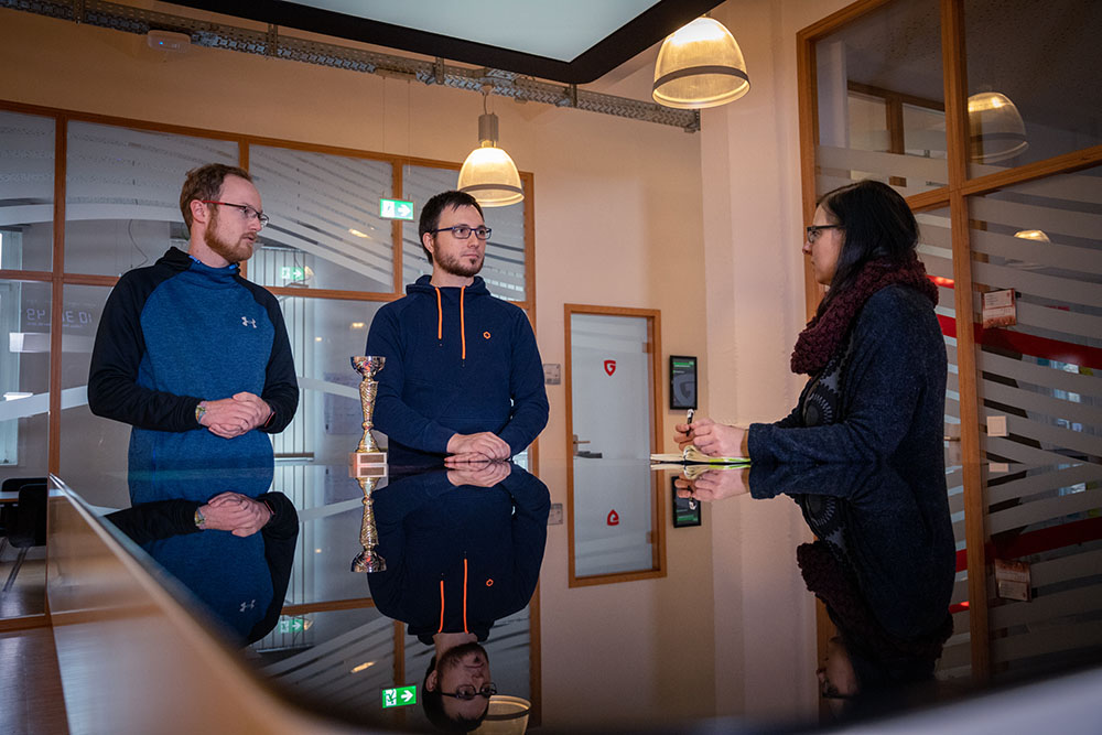 Am Ende des Semesters bekommen alle Studenten der Fakultät Auswertungsbögen überreicht und können Feedback zu ihren besuchten Veranstaltungen geben. Mit folgendem Ergebnis: Der Lehrer-Lämpel-Preis für das Wintersemester 2018/2019 geht an Stefan Hausotte und Florian Grieskamp. Der Preis – ein Wanderpokal, der seit über 40 Jahren von der Fachschaft Informatik vergeben wird – wurde bei der ersten Vorlesung des Wintersemesters 2019/2020 vom Fachschaftsrat verliehen. Vor den Augen der Studenten: „Das erhöht natürlich den Qualitätsdruck für dieses Semester“, lacht Stefan Hausotte.