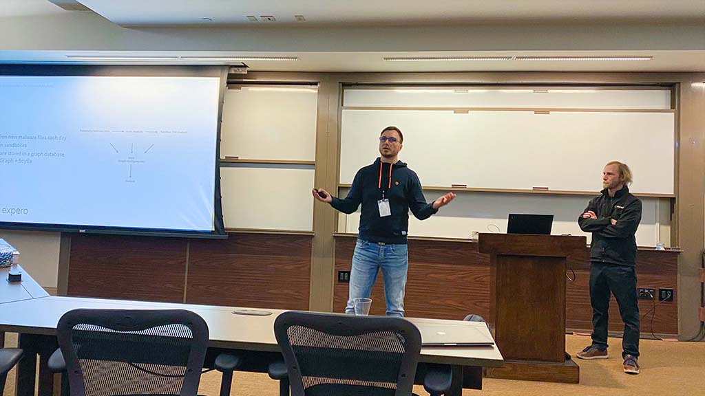 Dank der langjährigen Arbeit von G DATA an der Graphendatenbank haben wir mit vielen Leuten aus der Graph-Szene Kontakt. Die jährliche GGS ist der Ort, um diese zu treffen und mit ihnen die neuesten Fortschritte in der Graphentechnologie auszutauschen. Mir macht es immer viel Spaß, neue Ideen für unsere Tools zu sammeln und technische Schwierigkeiten mit Experten aus der ganzen Welt zu diskutieren. Dieses Jahr war jedoch etwas Besonderes, da ich unsere neueste Arbeit zusammen mit Ethan Hasson von Expero vorstellen konnte. Gegen Ende des Jahres 2019 haben wir zusammen mit Expero eine Benutzeroberfläche für den Browser entwickelt, um die Entdeckung von Bedrohungen in unserer Grafikdatenbank zu erleichtern. Die Zusammenarbeit mit Ethan war eine großartige Erfahrung. Obwohl der Atlantische Ozean zwischen dem Hauptsitz von G DATA und Expero liegt, sind wir im Handumdrehen ins Gespräch gekommen. Vor dem diesjährigen GGS hatte ich Ethan noch nie persönlich getroffen, da wir nur über Video-Chat kommuniziert haben.