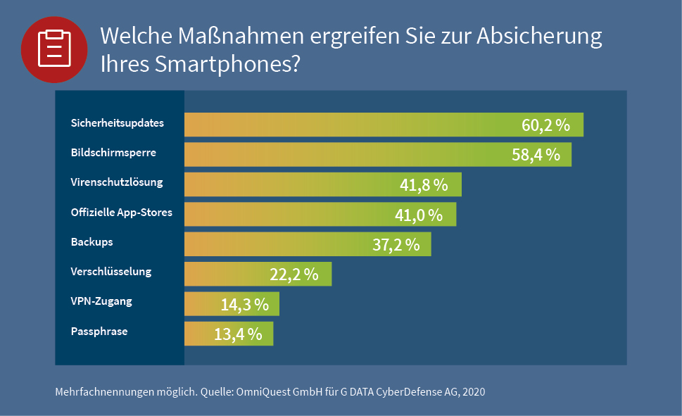 Dieser Teil unserer Umfrage zeigt uns vor allem eines: IT-Sicherheit ist auch bei Mobilgeräten nicht selbstverständlich. Wir müssen alle selbst umfassend dafür sorgen. Wir müssen uns der vielfältigen Gefahren, darunter Schadprogrammen, Geräteverlust und Datenabflüsse, bewusst werden und danach handeln. Dabei zeigt sich auch, dass es genauso wie im Unternehmensumfeld nicht reicht, einmal die App-Berechtigungen zu prüfen oder die Bildschirmsperre zu aktivieren. IT-Sicherheit ist keine einmalige Angelegenheit, sie begleitet uns immer, wenn wir das Mobilgerät benutzen und sollte auch jedes Mal beachtet werden. Damit schützen wir alle unsere digitale Identität und damit auch alle Daten, wie Bilder oder Kontakte.