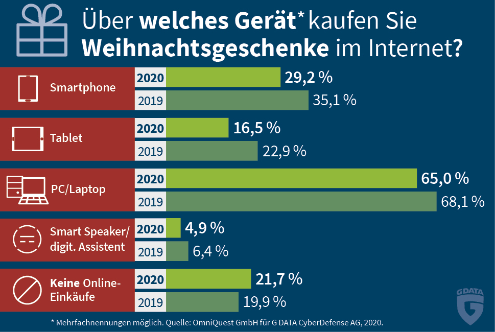 Generell sollten wir Internetnutzer niemals ohne eine umfassende und aktivierte Sicherheitslösung ins Netz gehen. Diese gehört wie das Betriebssystem zur Grundausstattung von Computern, Notebooks und Mobilgeräten. Für den Geschenkekauf nutzen wir oft nicht nur ein, sondern verschiede Geräte: Unsere Umfrage zum Thema Weihnachtsshopping zeigt, dass wir Deutschen mehrheitlich PC oder Notebook nutzen, um online Geschenke zu kaufen. Drei von zehn Verbrauchern (29,2 Prozent) setzen dabei auf das Smartphone. Das bedeutet, dass alle diese Geräte einen umfassenden Schutz benötigen.