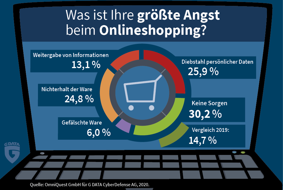Unsere Umfrage zeigt: Die größte Angst der Verbraucher (25,9 Prozent) ist das Ausspionieren von persönlichen Daten, zum Beispiel von Kreditkarten oder Benutzerkonten zu Onlineshops. 24,8 Prozent der Deutschen bereitet die Gefahr, die bestellte Ware nicht zu erhalten, obwohl der Kaufpreis bereits gezahlt wurde, das größte Kopfzerbrechen. Am wenigsten Angst haben die Befragten davor, gefälschte Ware zu erhalten (6 Prozent).