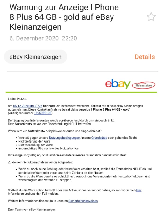 Zudem trudelte ein Warnhinweis von eBay Kleinanzeigen ein, in dem mir zu meinem Schutz vom Versand meines Handys abgeraten wurde.