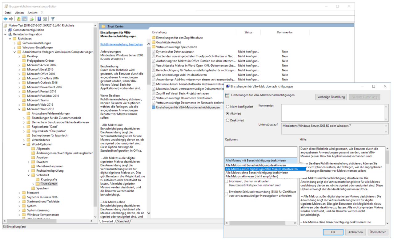Hinweis: Diese Einstellung deaktiviert unterschiedslos alle VBA-Makros, selbst wenn im Folgenden signierte Makros erlaubt werden. Gibt es zwei GPOs zu einer Einstellung, dann greift grundsätzlich immer die restriktivere Richtlinie.