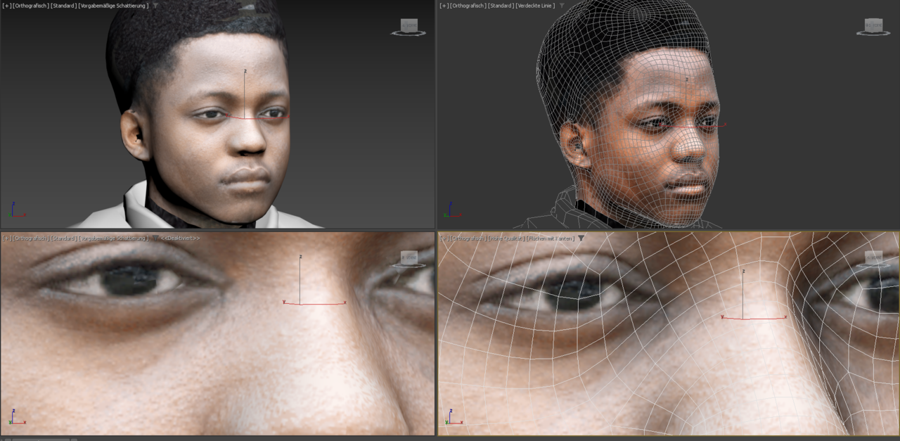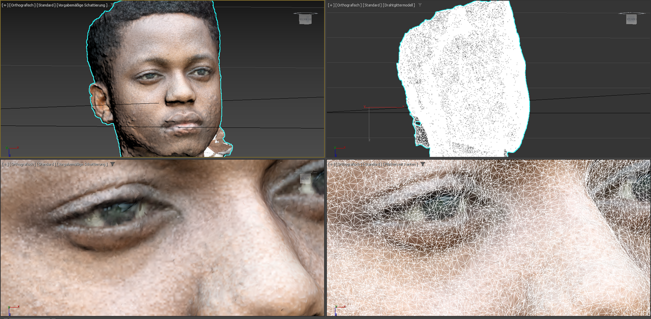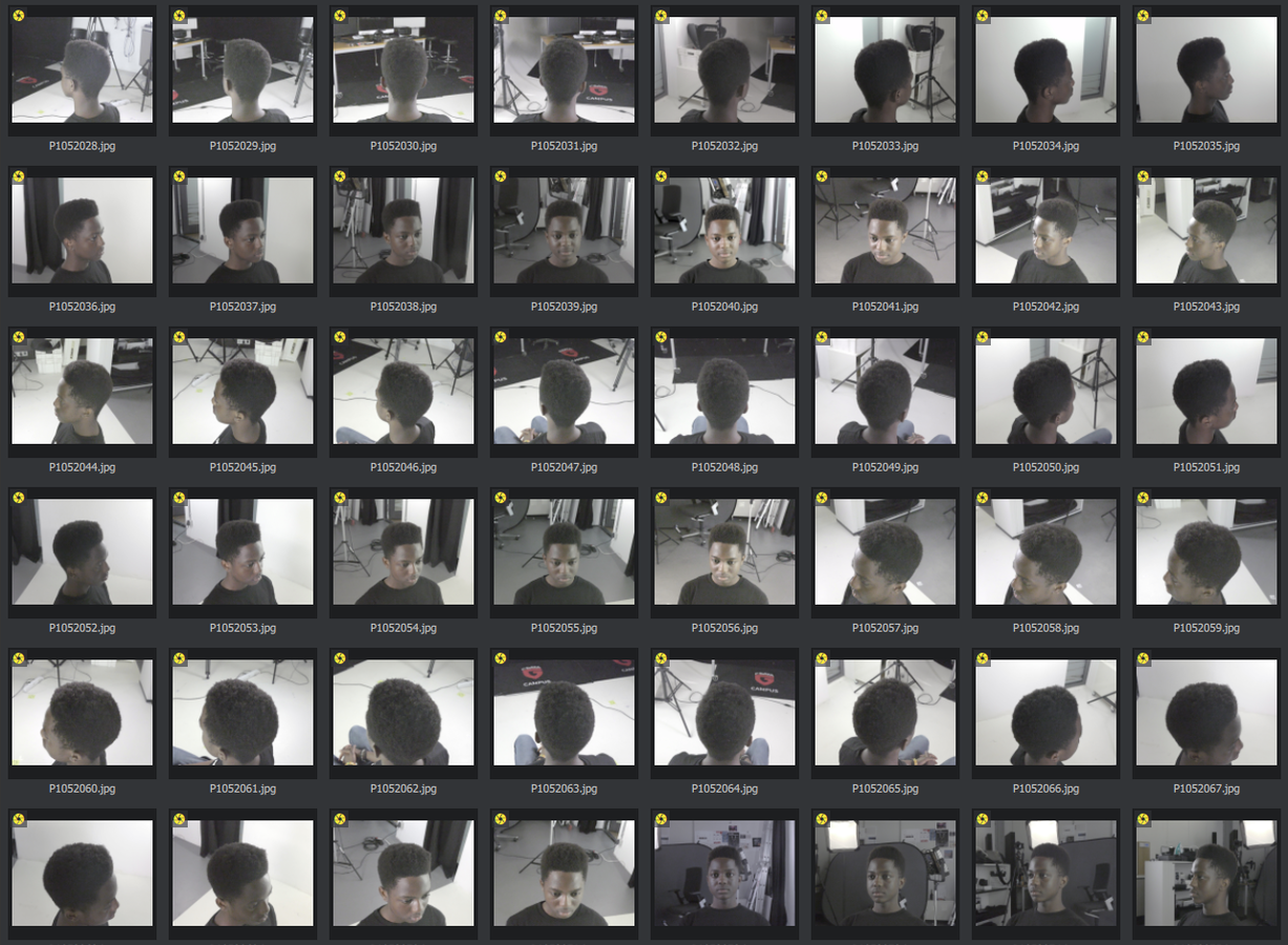 Die Grundlage für eine 3D-Modellierung sind ganz viele Bilder eines Objekts. In diesem Fall von dem Kopf der Schüler*innen, der im ersten Schritt von allen Seiten und aus unterschiedlichen Perspektiven aufgenommen werden musste. Insgesamt entstanden von jedem Kopf um die 130 Bilder. Zur Orientierung: Optimal sind 200 Bilder, aber schon mit 130 lässt sich ein sehr gutes Ergebnis erzielen. Im Anschluss daran hieß es: aussortieren und die gemachten Bilder bearbeiten. Bildbearbeitungsprogramme wie Lightroom und Photoshop kamen dazu zum Einsatz – aber auch kostenfreie wie GIMP sind zur Nachbearbeitung möglich, um die Belichtung, Schärfe, Kontraste usw. anzupassen, sodass alle Bilder einheitlich aussehen. Danach wurden alle Bilder eines Kopfes in eine 3D-Software – hier Meshroom – geladen, mit der ganz automatisch und mit Hilfe eines Algorithmus in drei bis sechs Stunden ein sogenanntes „High Poly“ entsteht. Dabei fügt die Software die Bilder zu einem ersten Modell zusammen, das aus Abertausenden von Dreiecken besteht. „High Poly“ bedeutet, dass so viele Details wie möglich abgebildet werden. Je mehr Details vorhanden sind, desto höher ist die Anzahl der Polygone. Bei dem erstellten Modell von Obiri sind der Kopf und auch das Gesicht sehr gut erkennbar. Wie auf den Bildern aber zu sehen, ist die Textur – sozusagen die „Hülle“, die um das spätere Modell gelegt wird und das Gesicht sowie die Haare darstellt – noch fehlerhaft oder weist Lücken auf. Aber auch das Modell, auf dem die Textur liegt, hat noch „Beulen“ und Unstimmigkeiten, wenn die Textur ausgeblendet wird.