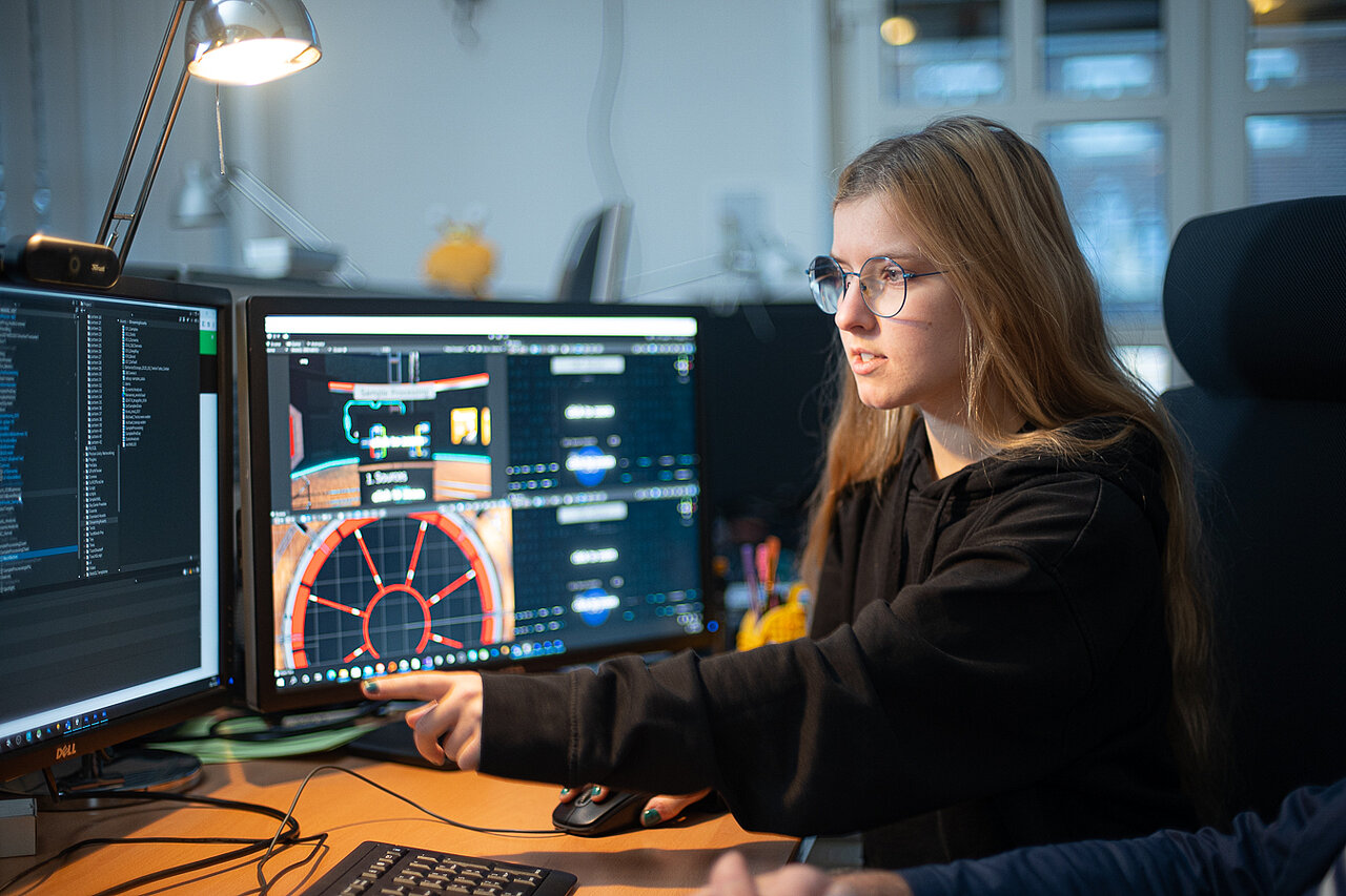 Mein Bruder und ich haben immer rumgesponnen, wie cool es wäre, Spieleentwickler*in zu sein – er sollte die Programmierung übernehmen und ich alles rund um die 3D-Animation, sprich die visuelle Komponente. Tatsächlich war es auch mein Bruder, der mich bei einer traditionellen Runde Playstation auf die Stellenausschreibung aufmerksam machte. Beim reinen Programmieren fehlt mir tatsächlich die kreative Seite, als ich mir die Stellenausschreibung durchgelesen hatte, war mir schnell klar: Mit dem Beruf habe ich beides, das ist es, was ich machen möchte! Gesagt, getan: Noch am selben Tag habe ich mich an die Bewerbung gesetzt.