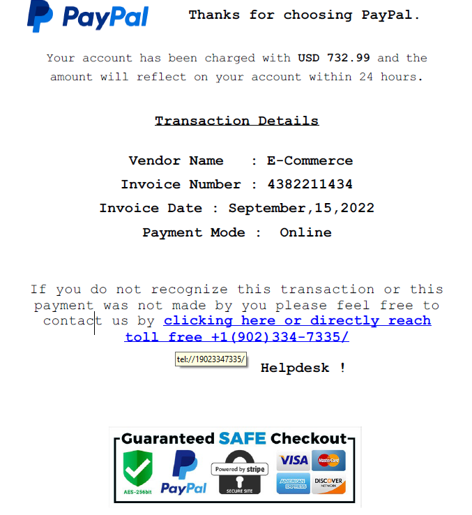 Das potenzielle Opfer erhält eine Nachricht mit Anhang im PDF-Format über eine Paypal-Abbuchung. Interessanterweise enthält die Mail auch eine Kontaktmöglichkeit: eine Telefonnummer in den USA. Wer diese Nummer anruft, erreicht einen freundlichen Service-Mitarbeiter, der sogar deutsch spricht. Er erklärt, dass der oder die Anrufer*in zunächst die eigenen Paypal-Daten inklusive Passwort angeben muss, damit sie die Zahlung zurückbuchen können.
