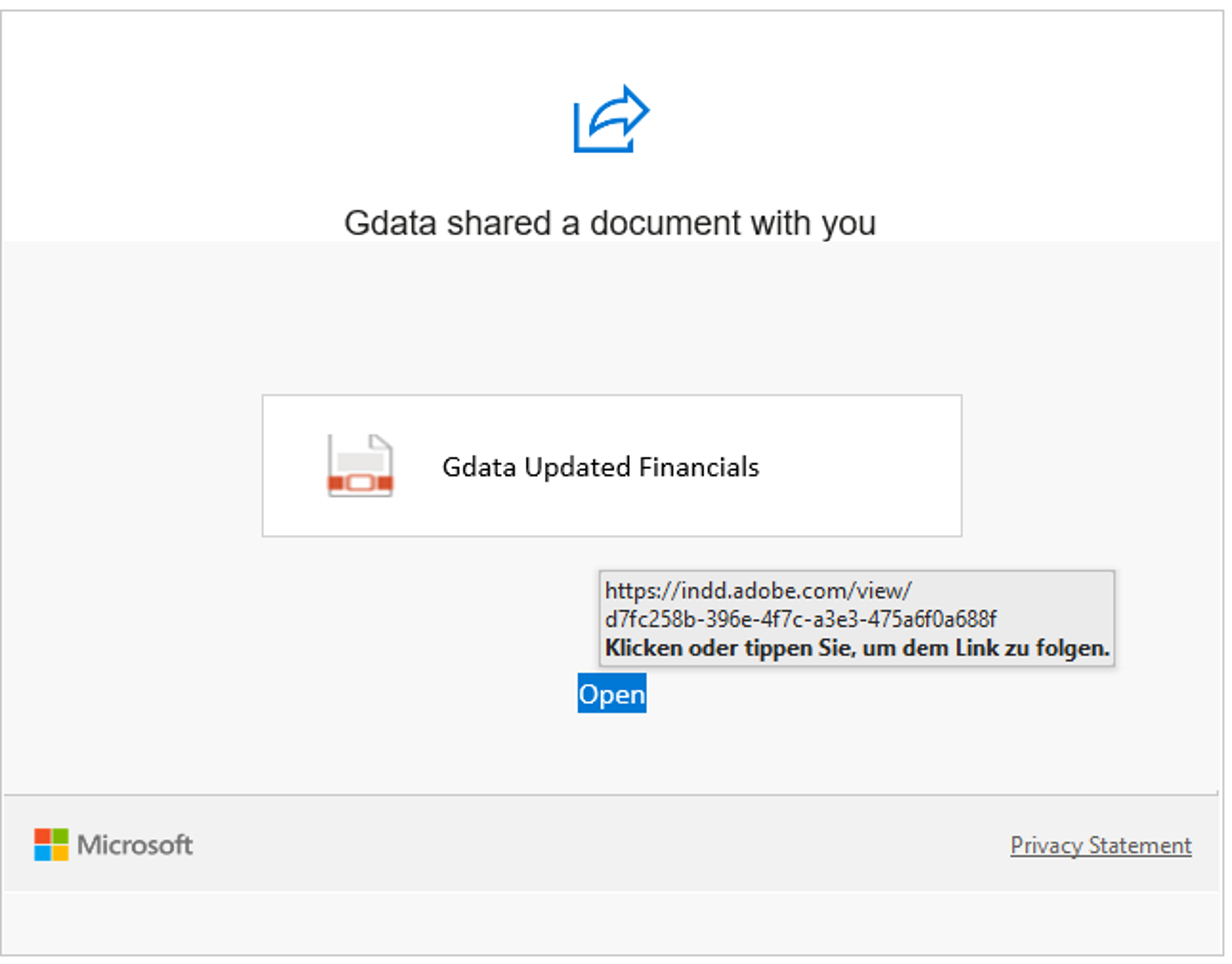 Beim zweiten Beispiel steht ein Missbrauch von InDesign-Seiten im Mittelpunkt. Ein Vorteil für Cyberkriminelle: Die Webseiten lassen sich direkt bei Adobe hosten und Shortlinks schnell generieren. Somit verschicken die Angreifer also eine authentische Mail von Adobe an ihre Opfer. Wer die Nachricht genauer betrachtet, stutzt sicherlich über das Privacy Statement von Microsoft. Wer aber auf den Trick hereinfällt und den Link in der Mail anklickt, landet erst dann auf der Phishing-Seite. Für die Empfänger*innen ist es also sehr schwer, die Falle zu erkennen, da es sich um eine echte Adobe-Seite handelt. Das Problem: Diese lassen sich nicht blocken, weil sonst das gesamte InDesign-Framework geblockt ist.