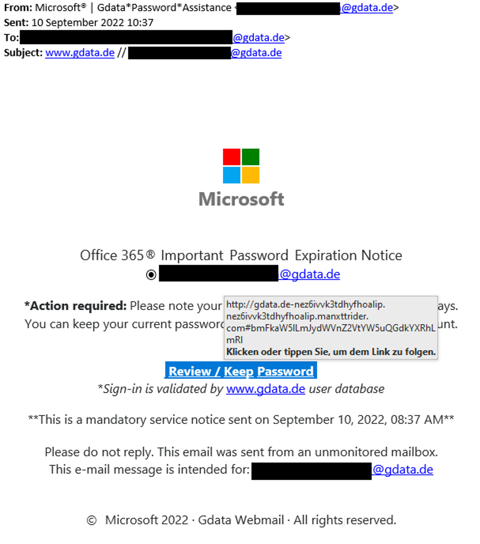 Die Nachricht von Microsoft über ein abgelaufenes Passwort gehört zu den Klassikern der Phisher. Bei einer aktuellen Methode sieht die Phishing-Mail auf den ersten Blick plausibel aus, weil auch die Adresse beim Mouse-Over mit gdata.de anfängt. Aber dann folgen Buchstaben und Zahlen, die den eigentlichen Absender verraten, nämlich manxtrider.com: Aber so weit prüfen manche Anwender*innen die Daten nicht. Der Blick geht nur auf gdata.de,die Opfer klicken den Link an und landen auf einer gefälschten Webseite. Hier geben sie dann im guten Glauben ihre Anmeldedaten preis.