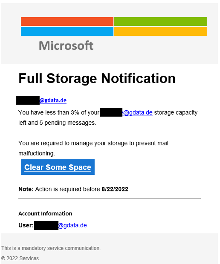 Ebenfalls ein Klassiker aus dem Phishingbaukasten: Eine Information über knapp werdenden Speicherplatz, direkt verknüpft mit einem – natürlich falschem – Link, um mehr Speicher freizuschalten. Die Angreifer bauen auch Druck auf, um ihr Opfer zu einer schnellen und unüberlegten Handlung zu zwingen. Bei diesem Angriff setzen die kriminellen Hacker einen legalen Mailservice namens Contactmonkey ein. Eine valide E-Mail-Software, die viele Unternehmen für den Versand von Werbe-Mails nutzen. Allerdings ist die Absender-Adresse direkt mit einer anderen Adresse verknüpft. Auch hier müssen Nutzer*innen schon genauer hinschauen, um den Betrug zu erkennen.