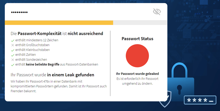 Gesagt getan, und siehe da: Nach der Eingabe zeigte sich, dass die Komplexität ihres neuen Kennwortes noch immer nicht ausreichend ist. In ihrem Fall fehlten noch Großbuchstaben und Sonderzeichen. „476x in einer Datenbank mit kompromittierten Passwörtern?!“, fragte sie mich. „Was kann ich mir jetzt genau darunter vorstellen?“ Die Antwort darauf ist recht simpel: Wird ein Passwort 476-mal in einer Datenbank mit kompromittierten Passwörtern gefunden, bedeutet es, dass es in einer Liste mit gehackten oder gestohlenen Passwörtern enthalten ist. Diese Datenbanken werden oft von Cyberkriminellen genutzt, um Zugang zu Konten zu erlangen, indem sie die gestohlenen Passwörter ausprobieren.
