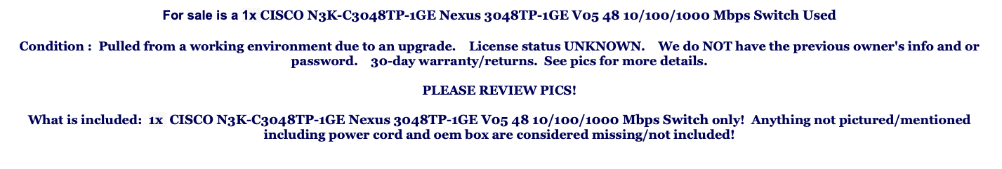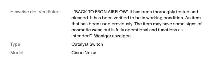 Doch nicht nur Rechner mit vertraulichen Daten finden regelmäßig ihren Weg in Online-Auktionen, auch Netzwerk-Hardware findet sich zuhauf in den Verkaufsplattformen. Viele davon sind Geräte, die aufgrund von Modernisierungen ausgetauscht werden. Die verkaufte Hardware wird entweder nicht mehr oder nur noch kurze Zeit vom Hersteller unterstützt. Oft finden sich in den Artikelbeschreibungen solcher Auktionen Sätze wie „Gerät hat zuletzt einwandfrei funktioniert“, „Gerät geht an, Lüfter drehen sich“ oder „Wurde nur aus dem Rack ausgebaut“. Gerade kurz vor einem Modellwechsel oder kurz vor Stichtag der Abkündigung einer Geräteserie finden veraltete Switches und Router beinahe containerweise den Weg auf den Gebrauchtmarkt.