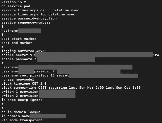 Ab diesem Punkt kann man den Switch eigentlich auch ausschalten, denn alle Informationen stecken in der gerade gesicherten Konfigurationsdatei. Passwörter gehören dazu ebenso wie detaillierte Informationen, welcher Port welchem VLAN innerhalb des Netzwerkes zugewiesen ist, und welches VLAN auf welches zugreifen darf. Gerade die Passwörter verdienen besondere Aufmerksamkeit, denn diese sind je nach Modell des Switches von unterschiedlicher Qualität, was die Sicherung angeht. Was man nicht sehen möchte, sind Passwörter mit „Type 7“ – diese sind unzureichend sicher verschlüsselt. Hier gibt es Werkzeuge, die ohne Zeitverzögerung das Klartext-Passwort ausspucken.