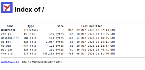 Sowohl die unterstützende Infrastruktur als auch die zugehörigen Skripte von Kiss Loader befanden sich zum Zeitpunkt der Analyse noch in der Entwicklung. Das exponierte WebDAV-Verzeichnis wies keine Zugriffsbeschränkungen auf, was es mir ermöglichte, seine Inhalte direkt aufzulisten und abzurufen. Ich stellte außerdem fest, dass die Dateien er kürzlich bereitgestellt worden waren, da ich sie erstmals am 10. März identifizieren konnte (siehe Abbildung 3).