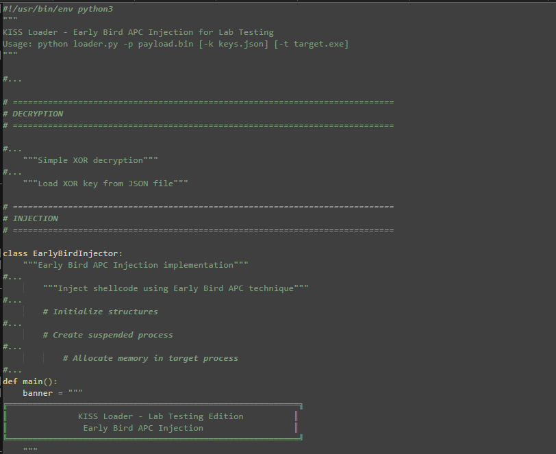 ![Python script header with shebang “#!/usr/bin/env python3” and text “KISS Loader - Early Bird APC Injection for Lab Testing” plus usage line “python loader.py -p payload.bin [-k keys.json] [-t target.exe]”. It shows sections “DECRYPTION” and “INJECTION,” comments like “Simple XOR decryption” and “Load XOR key from JSON file,” and a class EarlyBirdInjector with notes about creating a suspended process and allocating memory, followed by a banner “KISS Loader - Lab Testing Edition Early Bird APC Injection.”](/fileadmin/web/general/images/blog/2026/03/KissLoader_Figure_5.png)