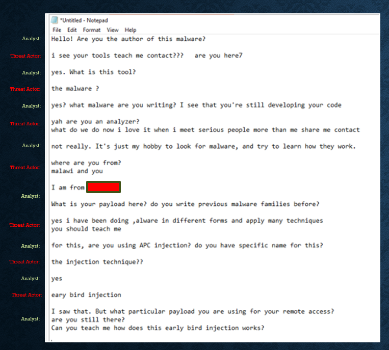 ![Screenshot of a Notepad window titled “Untitled - Notepad” showing a chat between “Analyst:” and “Threat Actor:” about malware, including lines like “Hello! Are you the author of this malware?” and “early bird injection.” The conversation mentions locations such as “malawi and you” and “I am from [redacted],” and includes questions about payloads, malware development, and how the injection technique works.](/fileadmin/web/general/images/blog/2026/03/KissLoader_Figure_7.png)