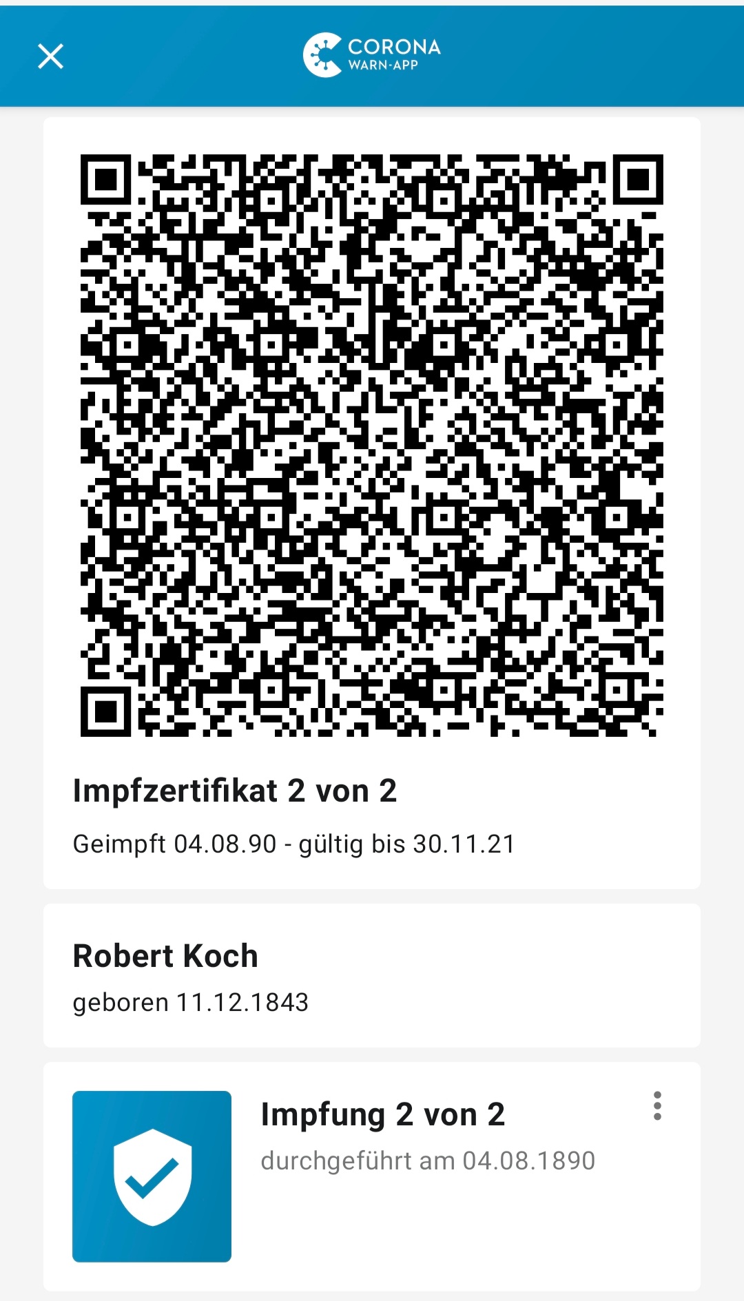 Dieser Impfnachweis ist natürlich offenkundig als falsch zu erkennen. Allerdings lassen sich mit untenstehendem Programmcode auch Impfnachweise für heute lebende Personen erzeugen. Diese Impfnachweise enthalten, genau wie der von uns für Robert Koch ausgestellte, zwar keine echte digitale Signatur. Die Corona-Warn-App akzeptiert sie zurzeit aber trotzdem.
